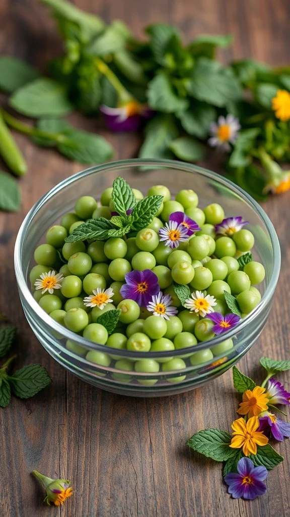 Spring Pea and Mint Salad Vibrant green peas paired with fresh mint create a refreshing salad that celebrates the season's bounty. Add edible flowers for an extra special touch that fits the celebration.