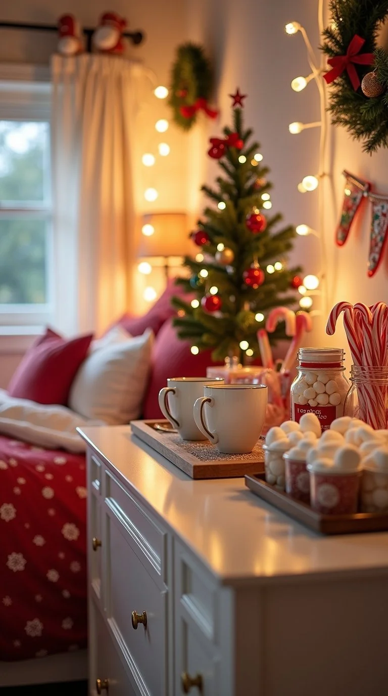 Hot cocoa station: For older kids, set up hot cocoa station on dresser with mugs, cocoa packets, marshmallows, and candy canes. Got all supplies for under $20.